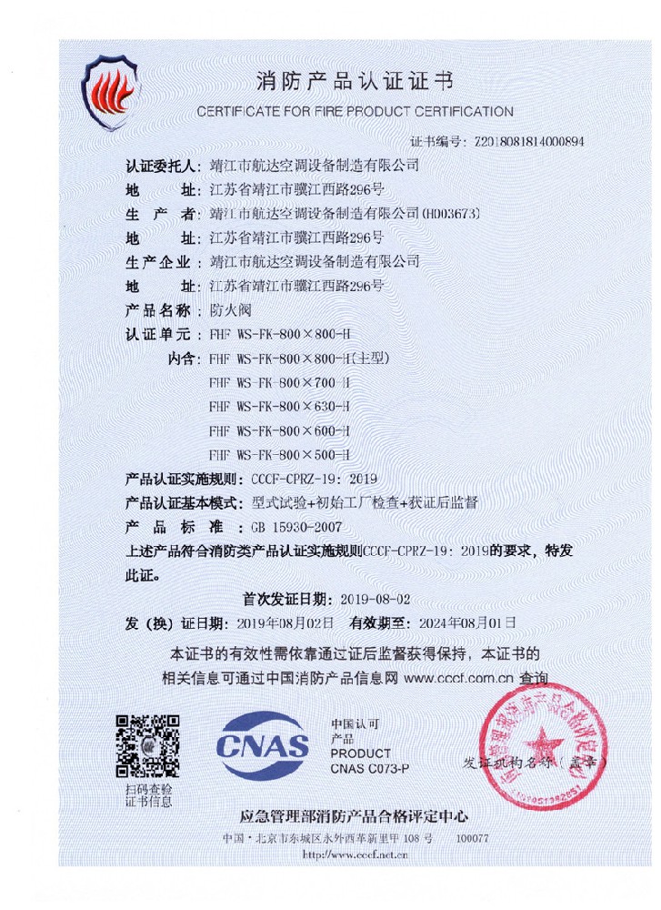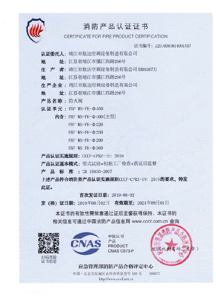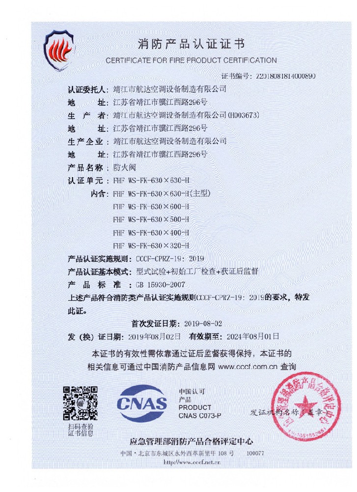 排煙防火閥證書